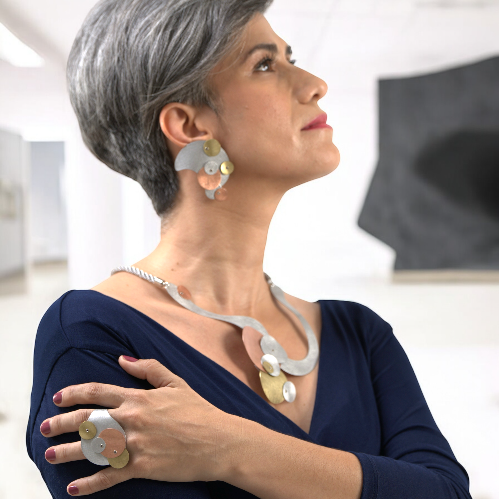 Imagine a long stretched balloon blown in the wind and holding on to a group of smaller spheres. A statement piece that will pop on any solid color top or dress. 22" Length x 4" Design piece Length (from center) Reversible design. Easy magnetic clasp Aluminum, Brass and copper Brass and Copper are sealed with polyurethane