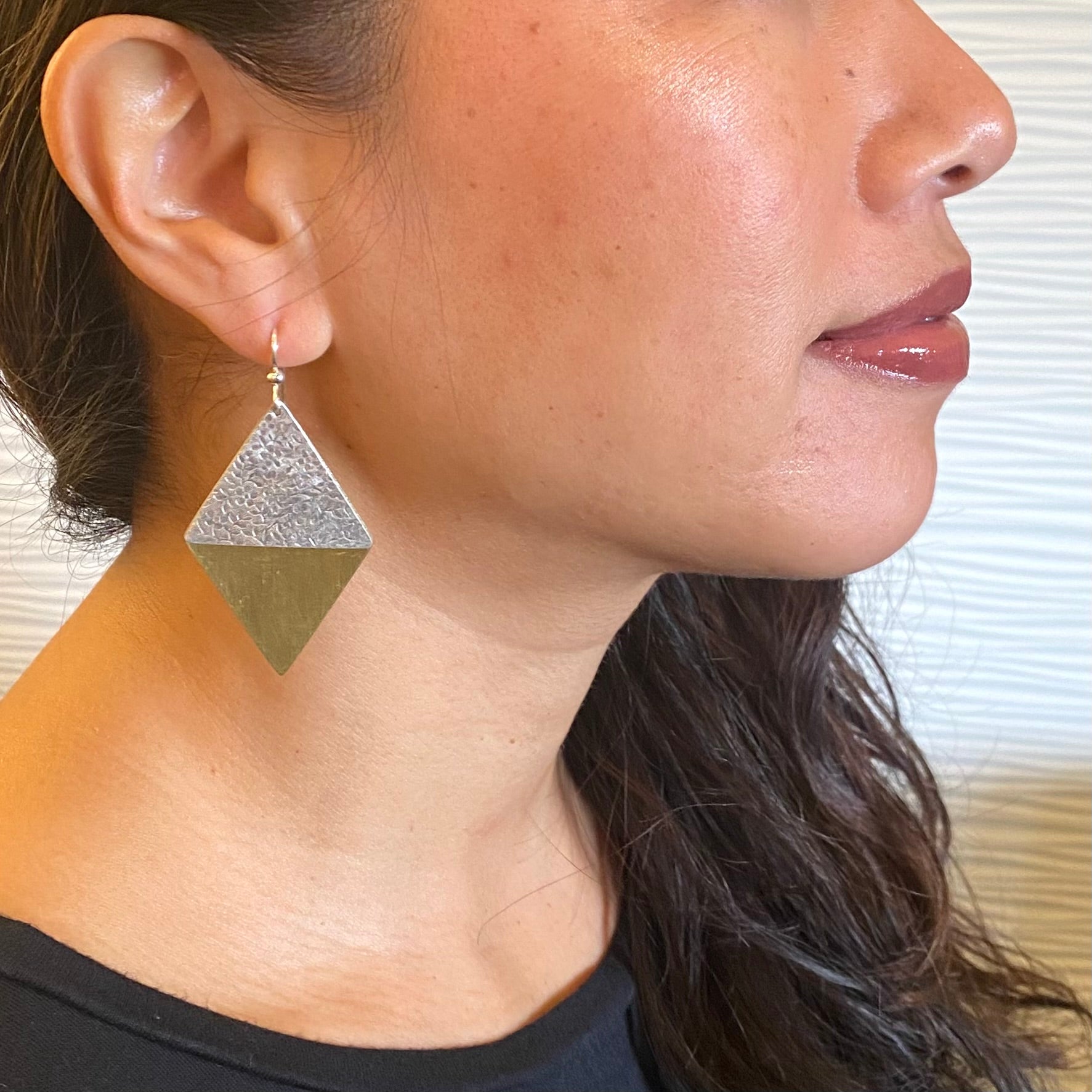 Dangling Diamond shaped earring1 1/2" overall lengthHand-cut, textured aluminum and brassBrass is treated with polyurethane to prevent oxidationSterling silver earwire