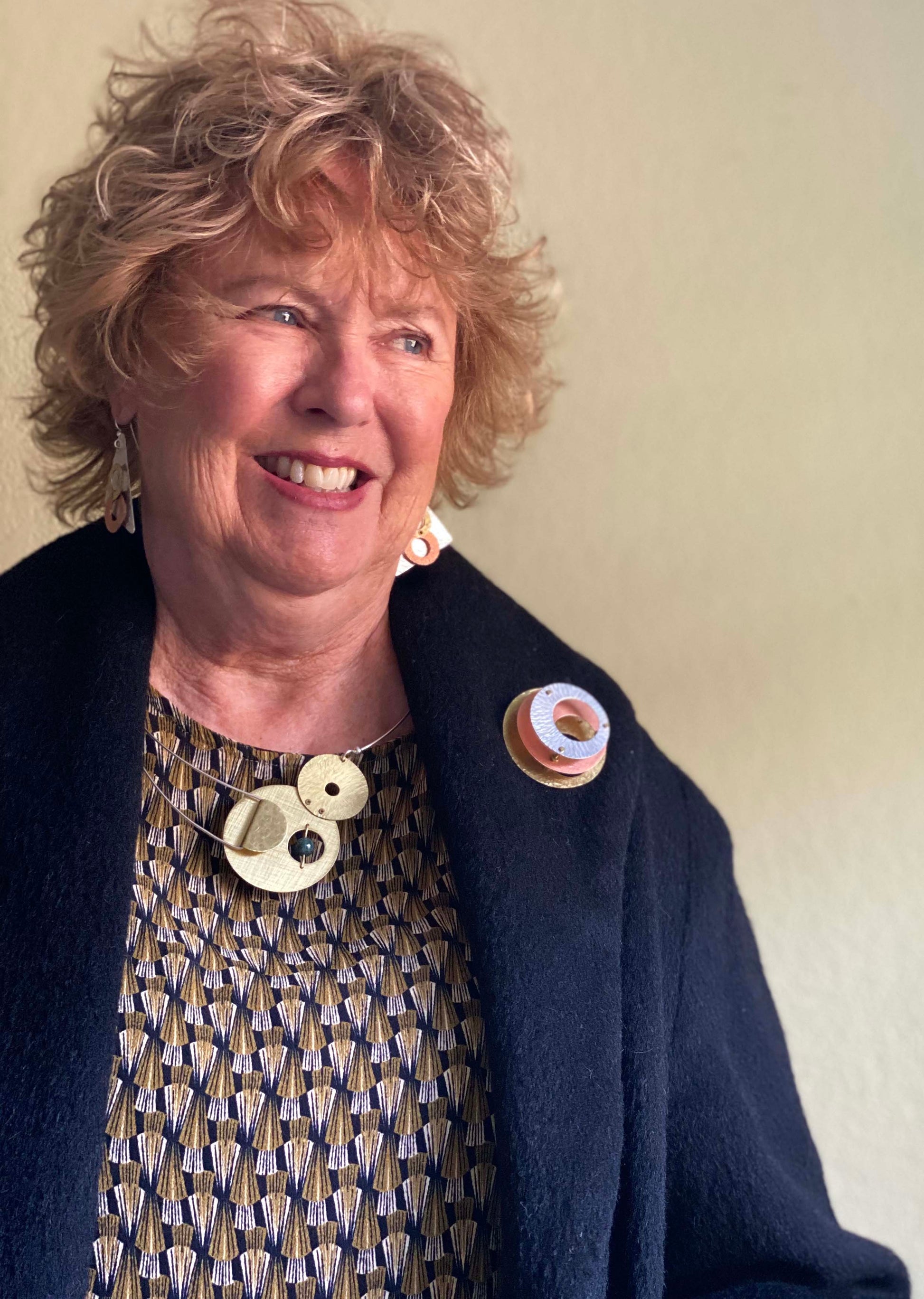 3 level mixed metal brooch. Offset circles of aluminum, copper and brass swirl out to make this pin a statement piece in its own right.