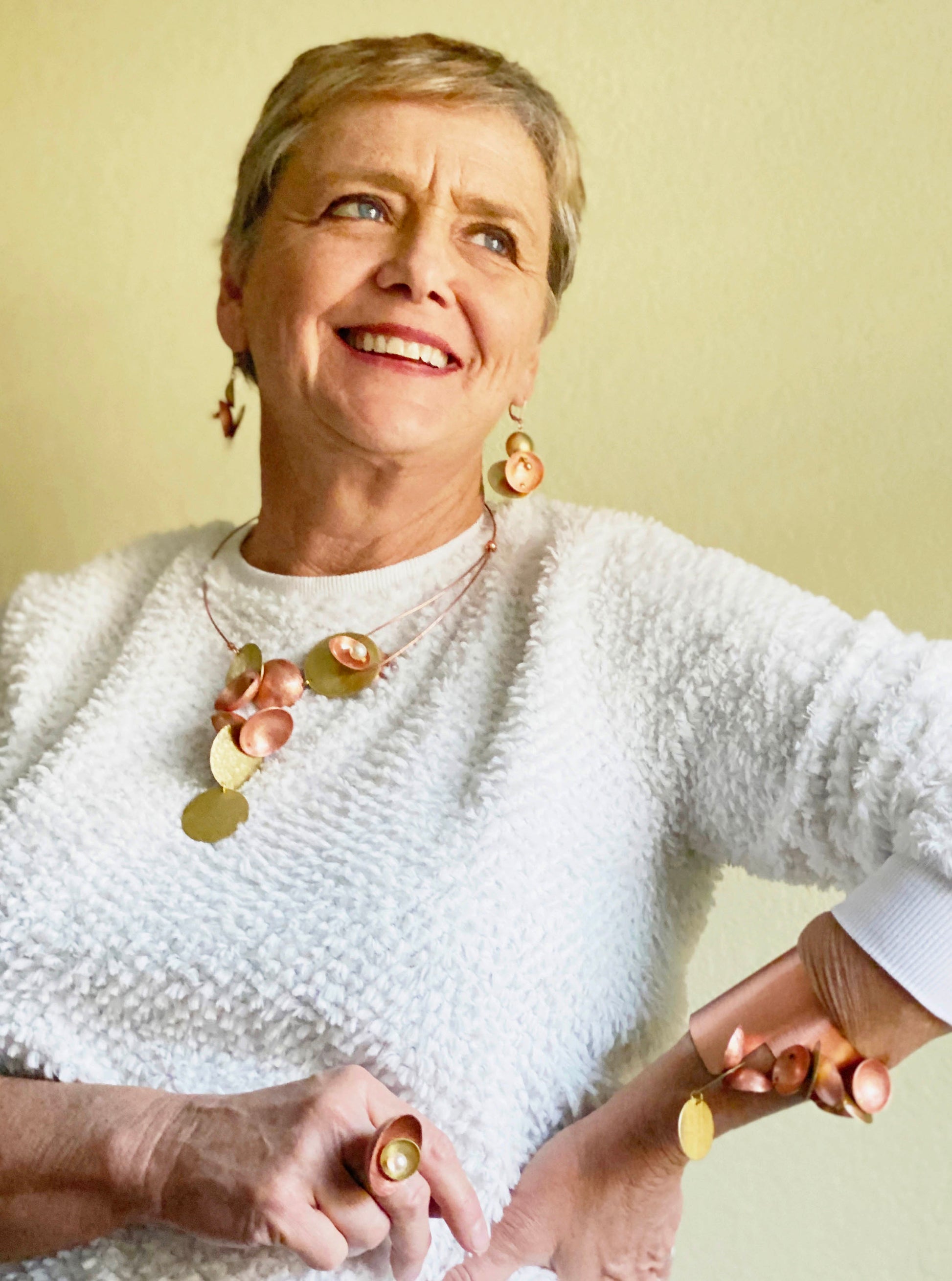 A fun tall ring that rises 1 1/4" from the top of the adjustable ring base. 1/2" wide aluminum or brass ring. Brass and copper are sealed with polyurethane to retard oxidation. Accent bead options: metal, Simulated Pearl, Guatemalan Jade